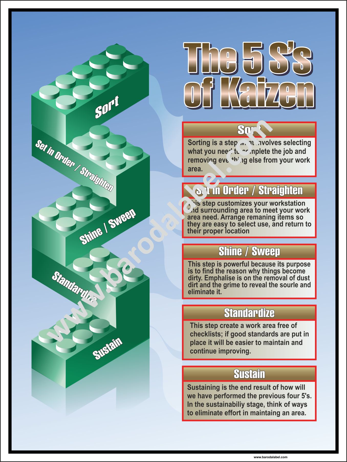 The 5 S’s of Kaizen Vinyl printed sticker, Digital printed available with or without lamination film pasted on 5 mm thick PVC sunboard or 3 mm thick ACP (Aluminium Composite Panel) Sheet. Sunboard signage with 4 eyelets or ACP signage with 4 holes provided for fixing.
