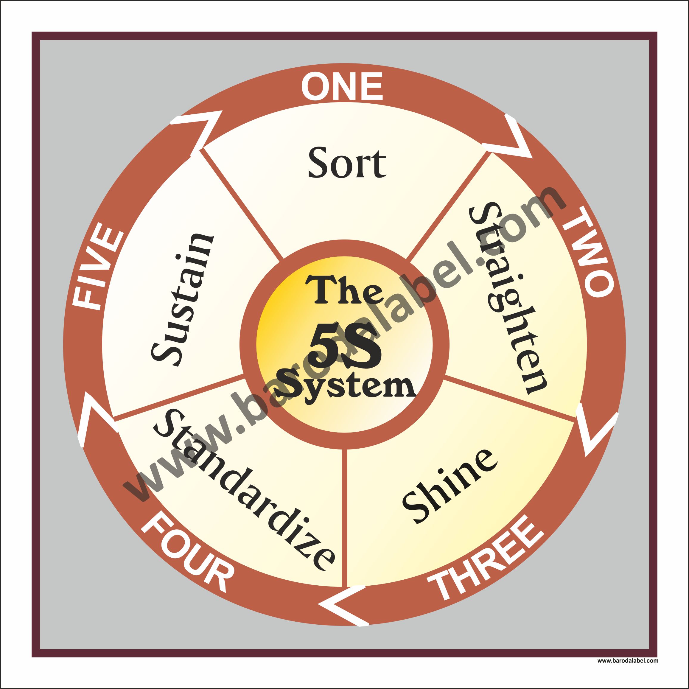 The 5 S System Vinyl printed sticker, Digital printed available with or without lamination film pasted on 5 mm thick PVC sunboard or 3 mm thick ACP (Aluminium Composite Panel) Sheet. Sunboard signage with 4 eyelets or ACP signage with 4 holes provided for fixing.