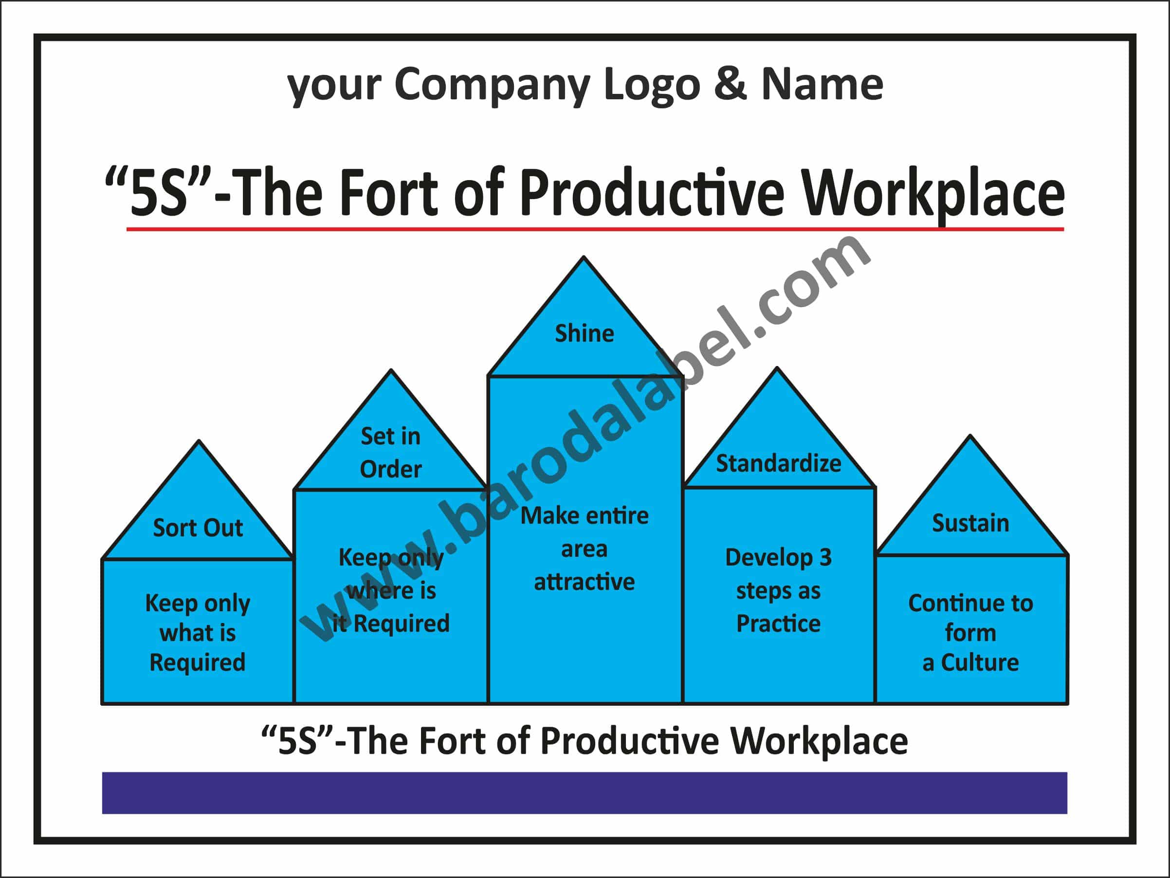 “5S” – The fort of Productive Workplace. Vinyl printed sticker, Digital printed available with or without lamination film pasted on 5 mm thick PVC sunboard or 3 mm thick ACP (Aluminium Composite Panel) Sheet. Sunboard signage with 4 eyelets or ACP signage with 4 holes provided for fixing.
