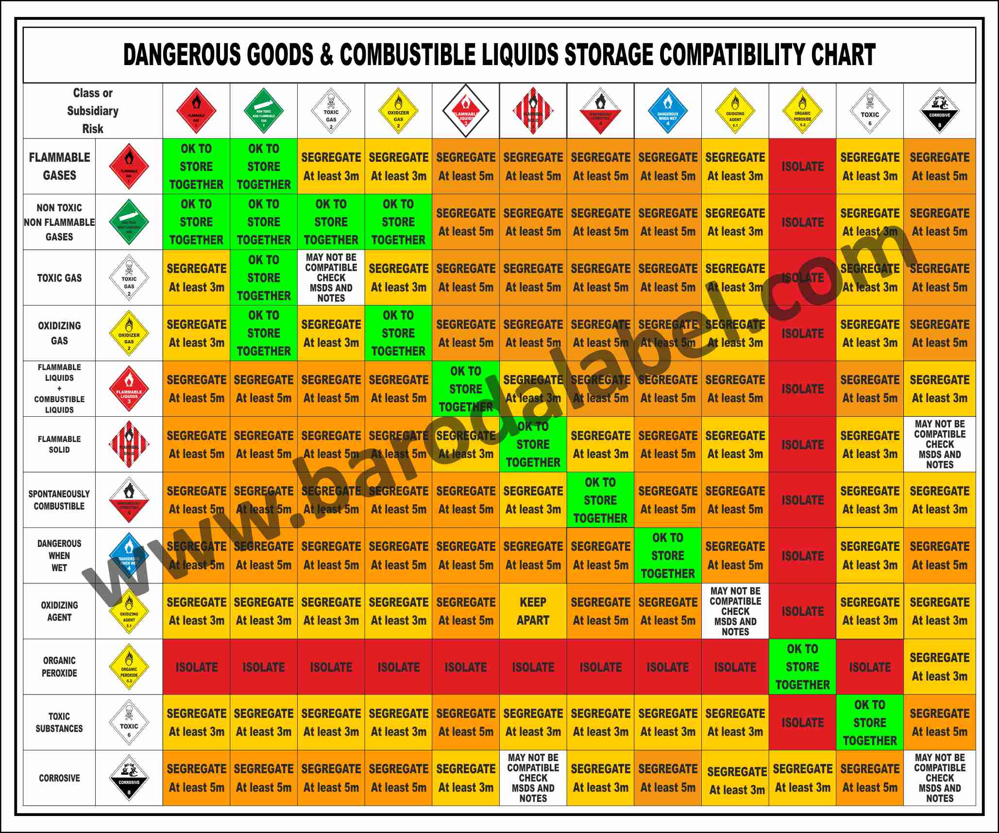 DANGEROUS GOODS & COMBUSTIBLE LIQUIDS STORAGE COMPATIBILITY CHART. Vinyl printed sticker, Digitally printed available with or without lamination film pasted on 5 mm thick PVC Sunboard or 3 mm thick ACP Sheet. Sunboard signage with 4 eyelets or ACP signage with 4 holes provided for fixing.