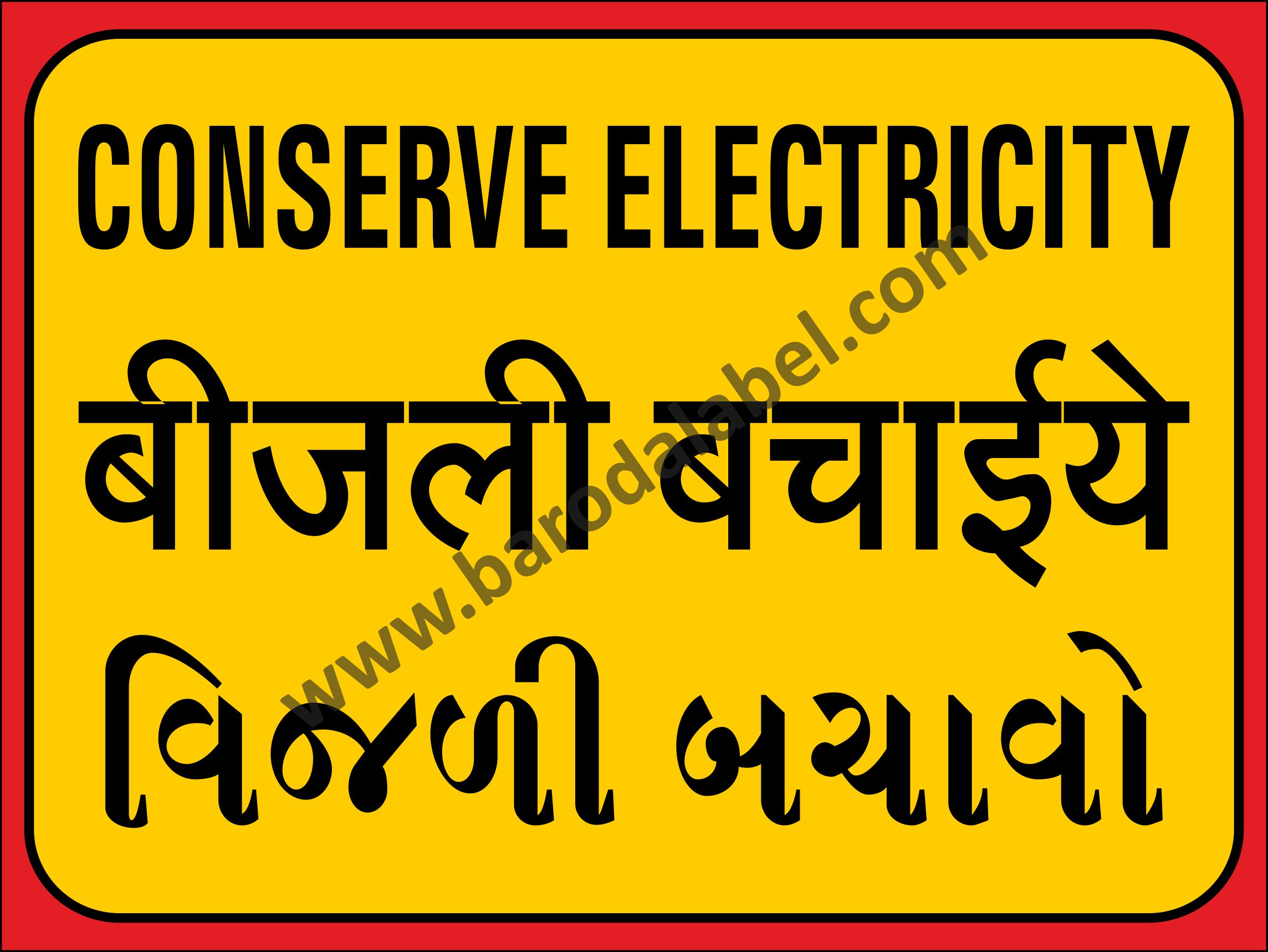 CONSERVE ELECTRICITY, BIJALI BACHAIYE, VIJADI BACHAVO Vinyl printed sticker, Digital printed available with or without lamination film pasted on 5 mm thick PVC sunboard or 3 mm thick ACP (Aluminium Composite Panel) Sheet. Sunboard signage with 4 eyelets or ACP signage with 4 holes provided for fixing.