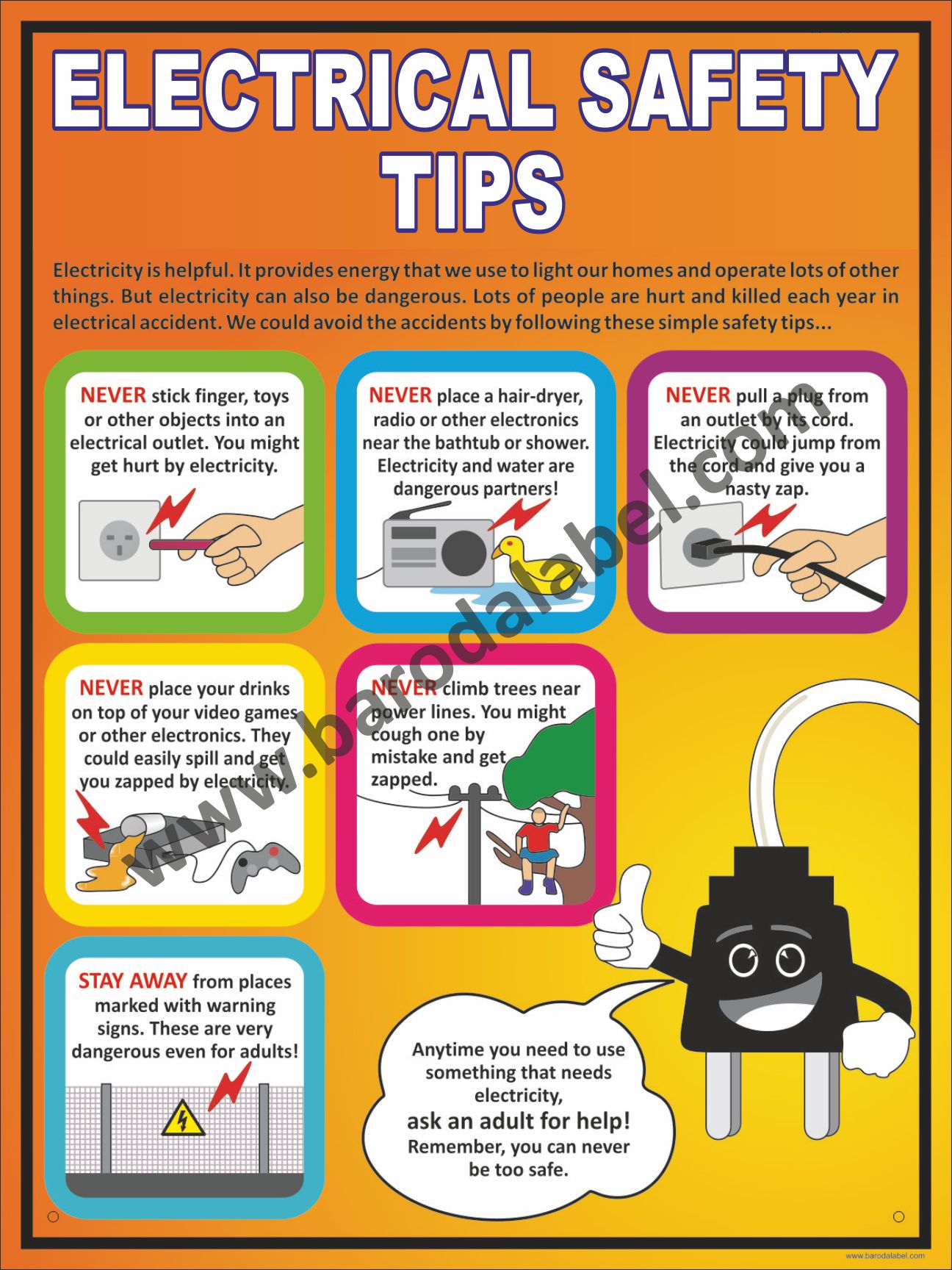 ELECTRICAL  SAFETY  TIPS Vinyl printed sticker, Digital printed available with or without lamination film pasted on 5 mm thick PVC sunboard or 3 mm thick ACP (Aluminium Composite Panel) Sheet. Sunboard signage with 4 eyelets or ACP signage with 4 holes provided for fixing.