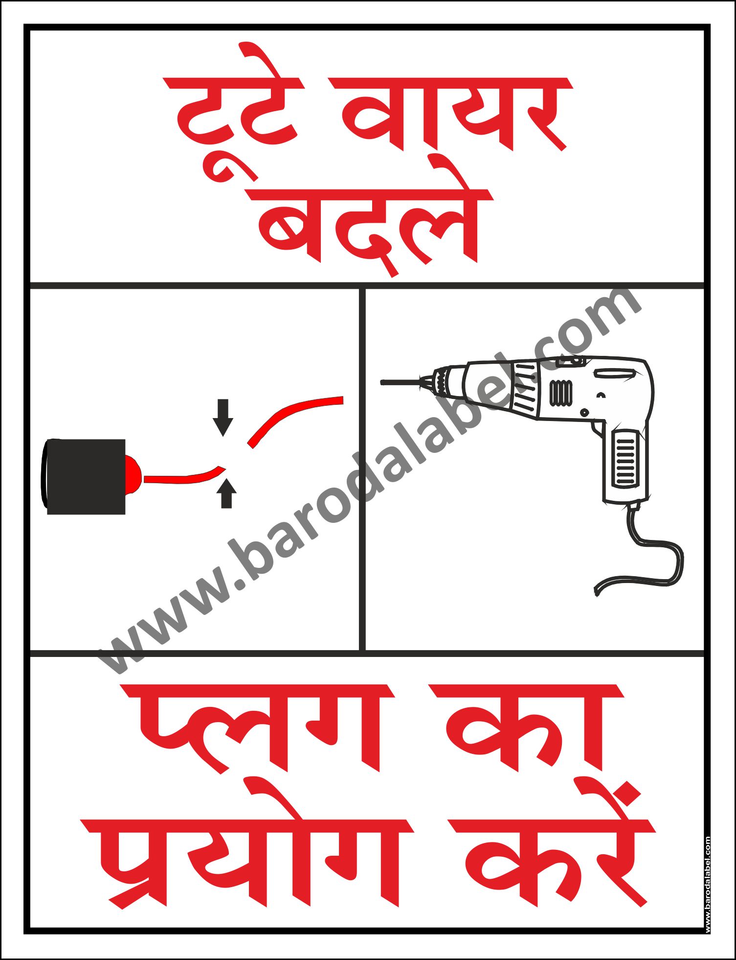 Tute wire badle, plug ka prayog kare (Hindi)Vinyl printed sticker, Digital printed available with or without lamination film pasted on 5 mm thick PVC sunboard or 3 mm thick ACP (Aluminium Composite Panel) Sheet. Sunboard signage with 4 eyelets or ACP signage with 4 holes provided for fixing.