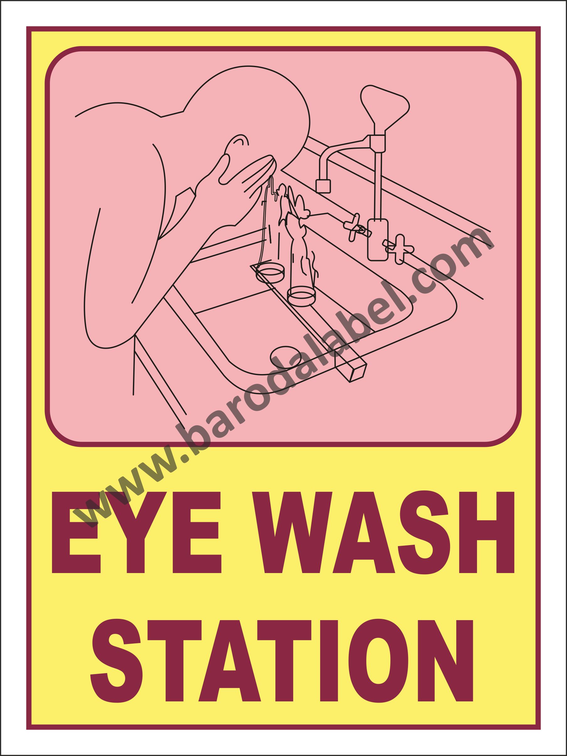 EYE WASH STATION. Vinyl printed sticker, Digital printed available with or without lamination film pasted on 5 mm thick PVC sunboard or 3 mm thick ACP (Aluminum Composite Panel) Sheet. Sunboard signage with 4 eyelets or ACP signage with 4 holes provided for fixing.