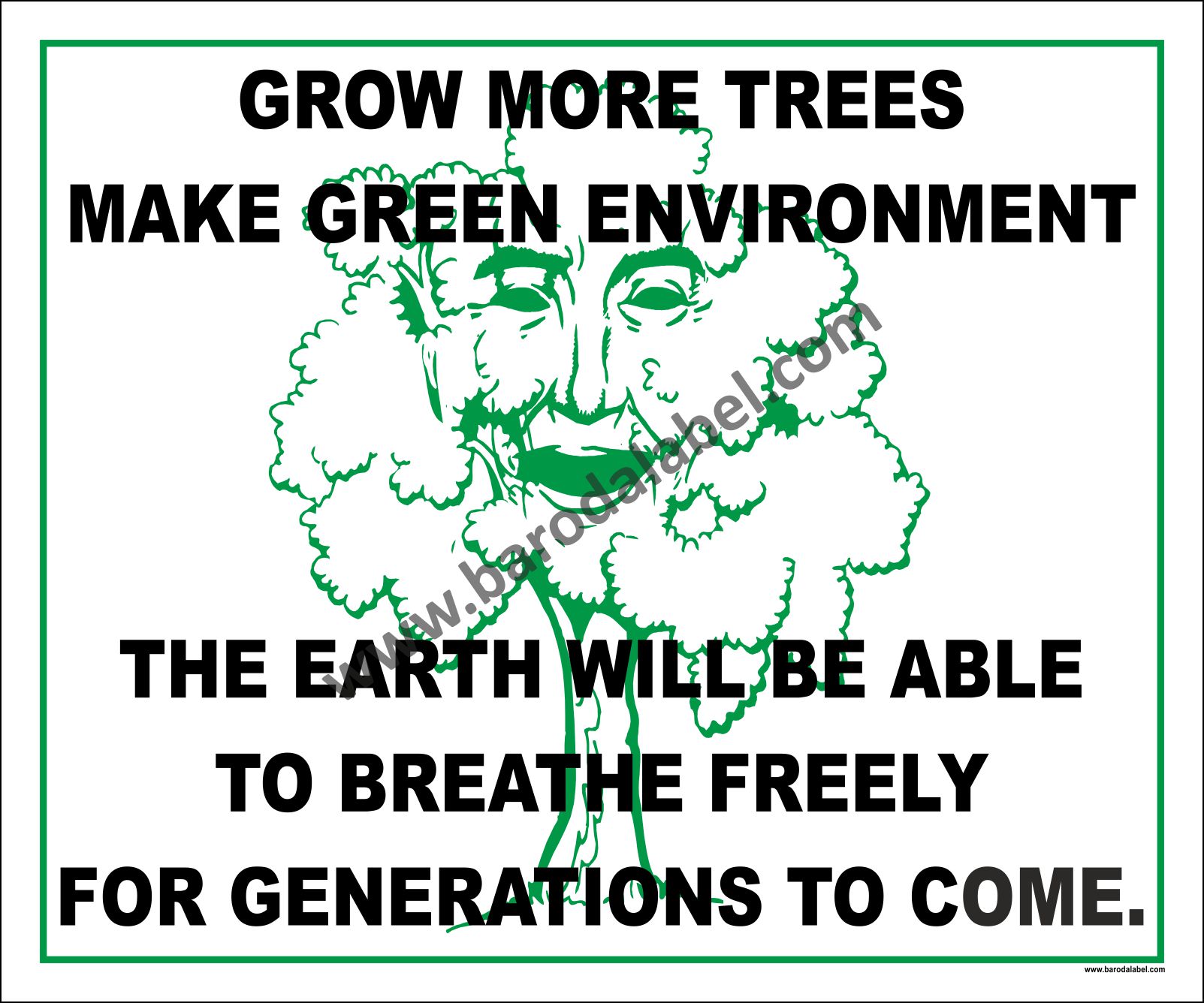 GROW MORE TREES MAKE GREEN ENVIRONMENT THE EARTH WILL BE ABLE TO BREATH FREELY FOR GENERATIONS TO COME.Vinyl printed sticker, Digital printed available with or without lamination film pasted on 5 mm thick PVC sunboard or 3 mm thick ACP (Aluminum Composite Panel) Sheet. Sunboard signage with 4 eyelets or ACP signage with 4 holes provided for fixing.