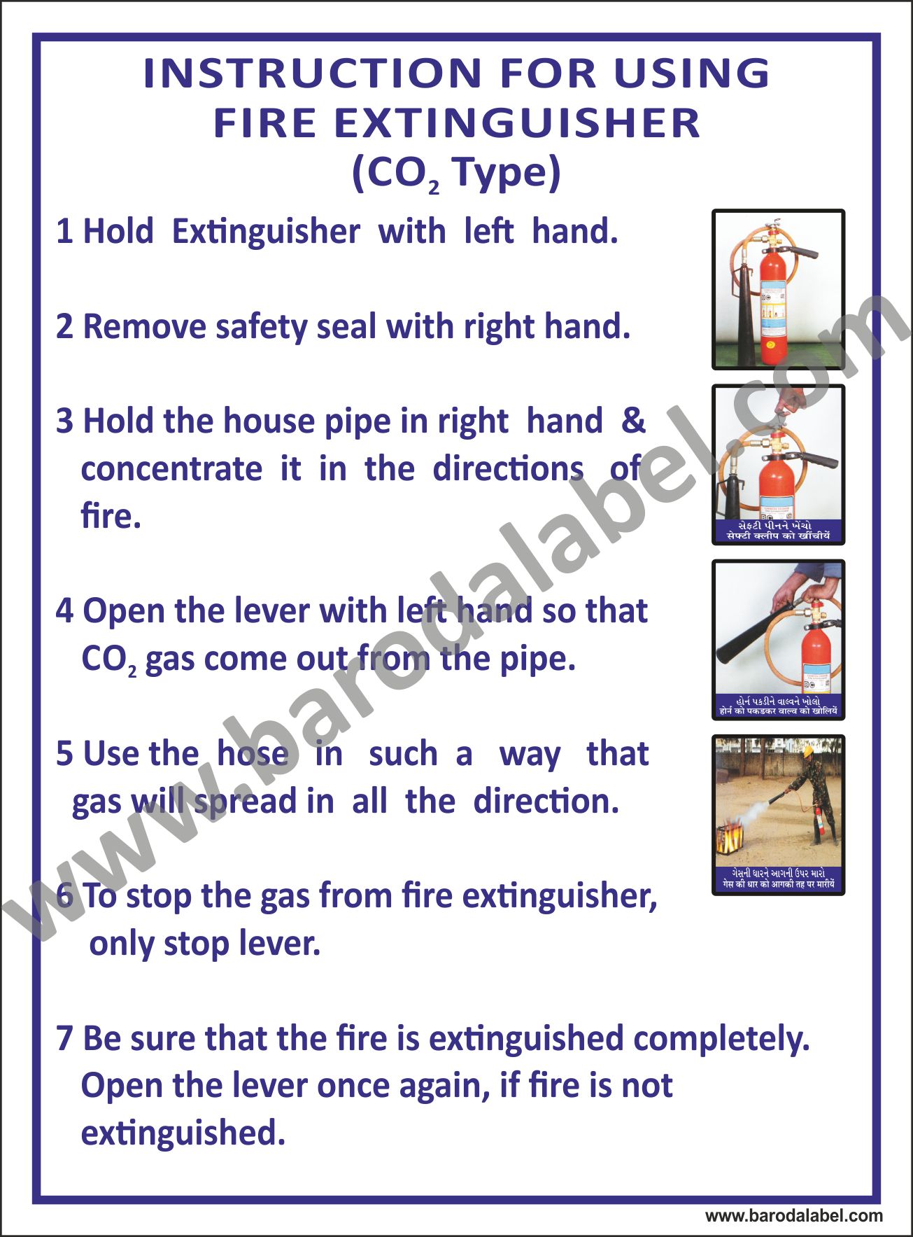 INSTRUCTION FOR USING FIRE EXTINGUISHER (CO2 TYPE) Vinyl printed sticker, Digitally printed available with or without lamination film pasted on 5 mm thick PVC Sunboard or 3 mm thick ACP Sheet. Sunboard signage with 4 eyelets or ACP signage with 4 holes provided for fixing.