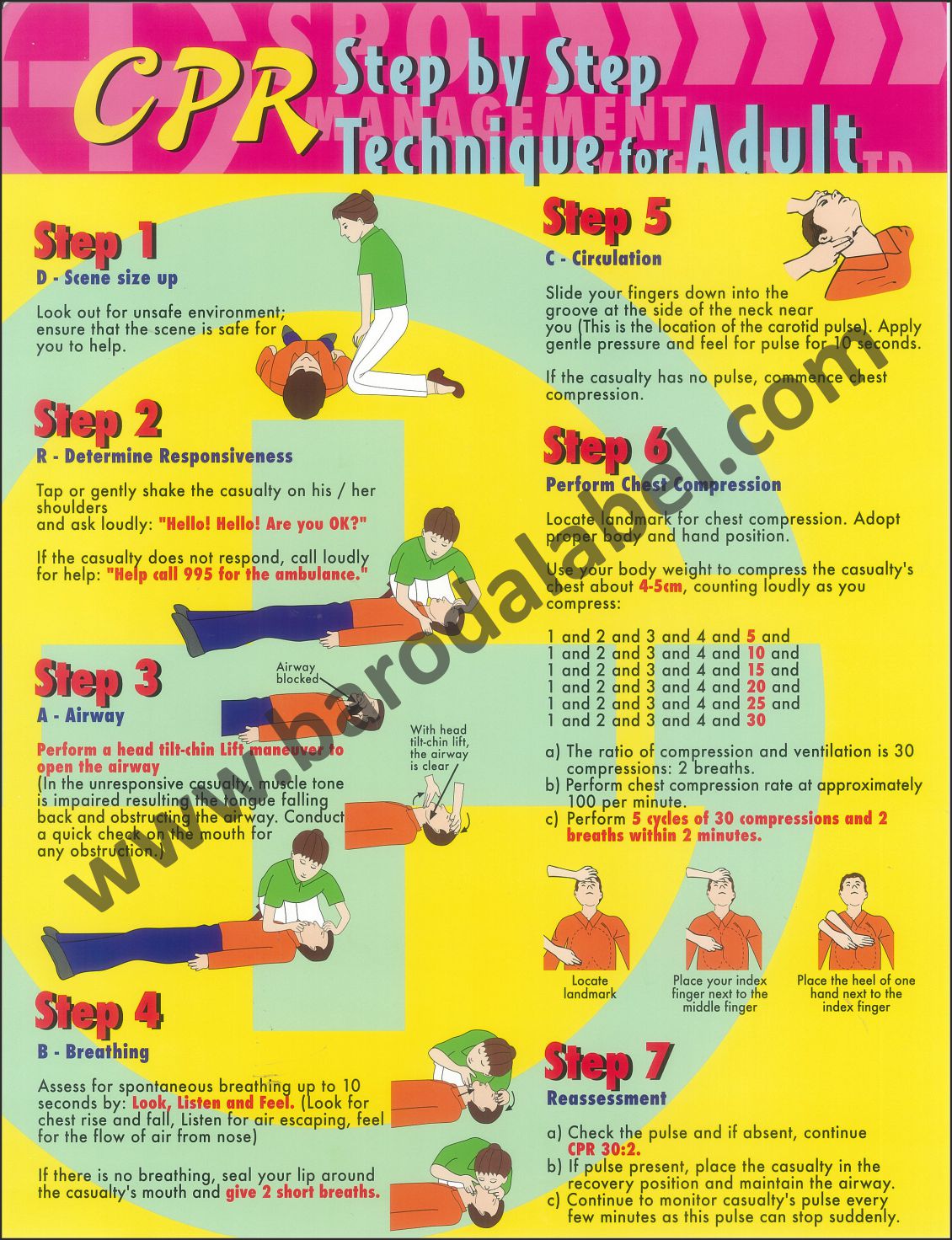 CPR Step by step Technique for Adult Vinyl printed sticker, Digitally printed available with or without lamination film pasted on 5 mm thick PVC sunboard or 3 mm thick ACP (Aluminum Composite Panel) Sheet. Sunboard signage with 4 eyelets or ACP signage with 4 holes provided for fixing.
