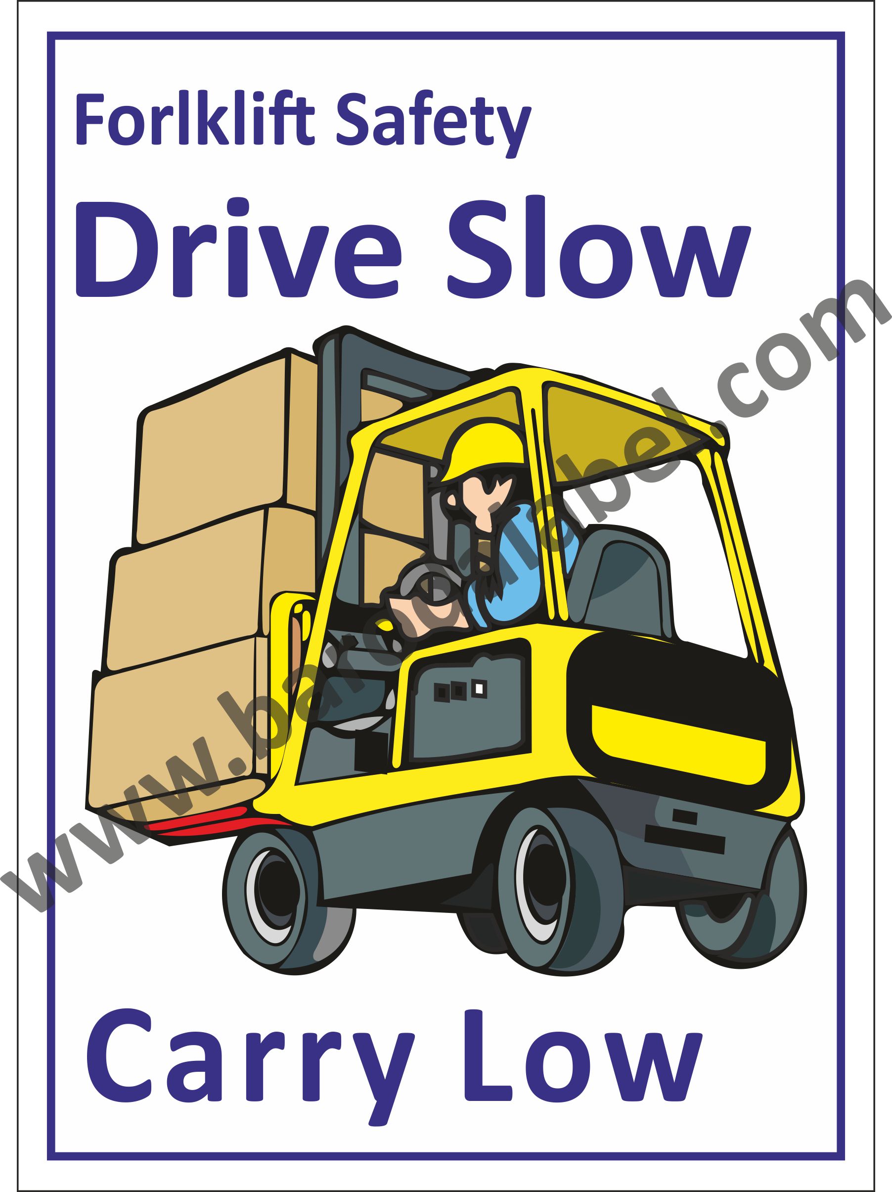 Forklift Safety Drive Slowly Carry Low Vinyl printed sticker, Digitally printed available with or without lamination film pasted on 5 mm thick PVC sunboard or 3 mm thick ACP (Aluminum Composite Panel) Sheet. Sunboard signage with 4 eyelets or ACP signage with 4 holes provided for fixing.
