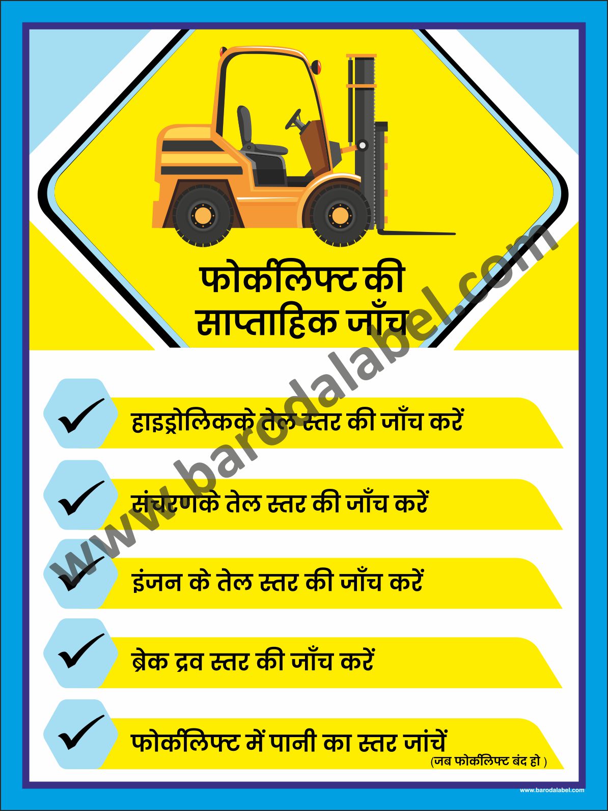 Forklift ki Saptahik Janch (Hindi) Vinyl printed sticker, Digitally printed available with or without lamination film pasted on 5 mm thick PVC sunboard or 3 mm thick ACP (Aluminum Composite Panel) Sheet. Sunboard signage with 4 eyelets or ACP signage with 4 holes provided for fixing.