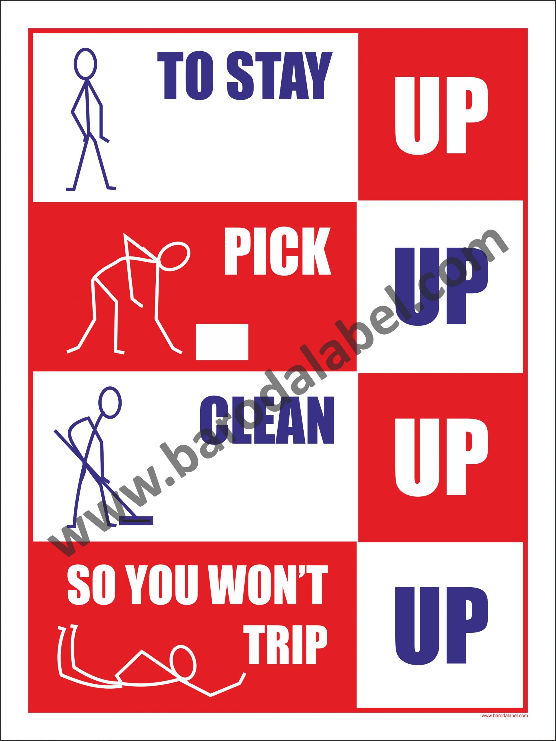 TO STAY UP PICK UP CLEAN UP SO YOU WON’T TRIP UP Vinyl printed sticker, Digitally printed available with or without lamination film pasted on 5 mm thick PVC sunboard or 3 mm thick ACP (Aluminum Composite Panel) Sheet. Sunboard signage with 4 eyelets or ACP signage with 4 holes provided for fixing.