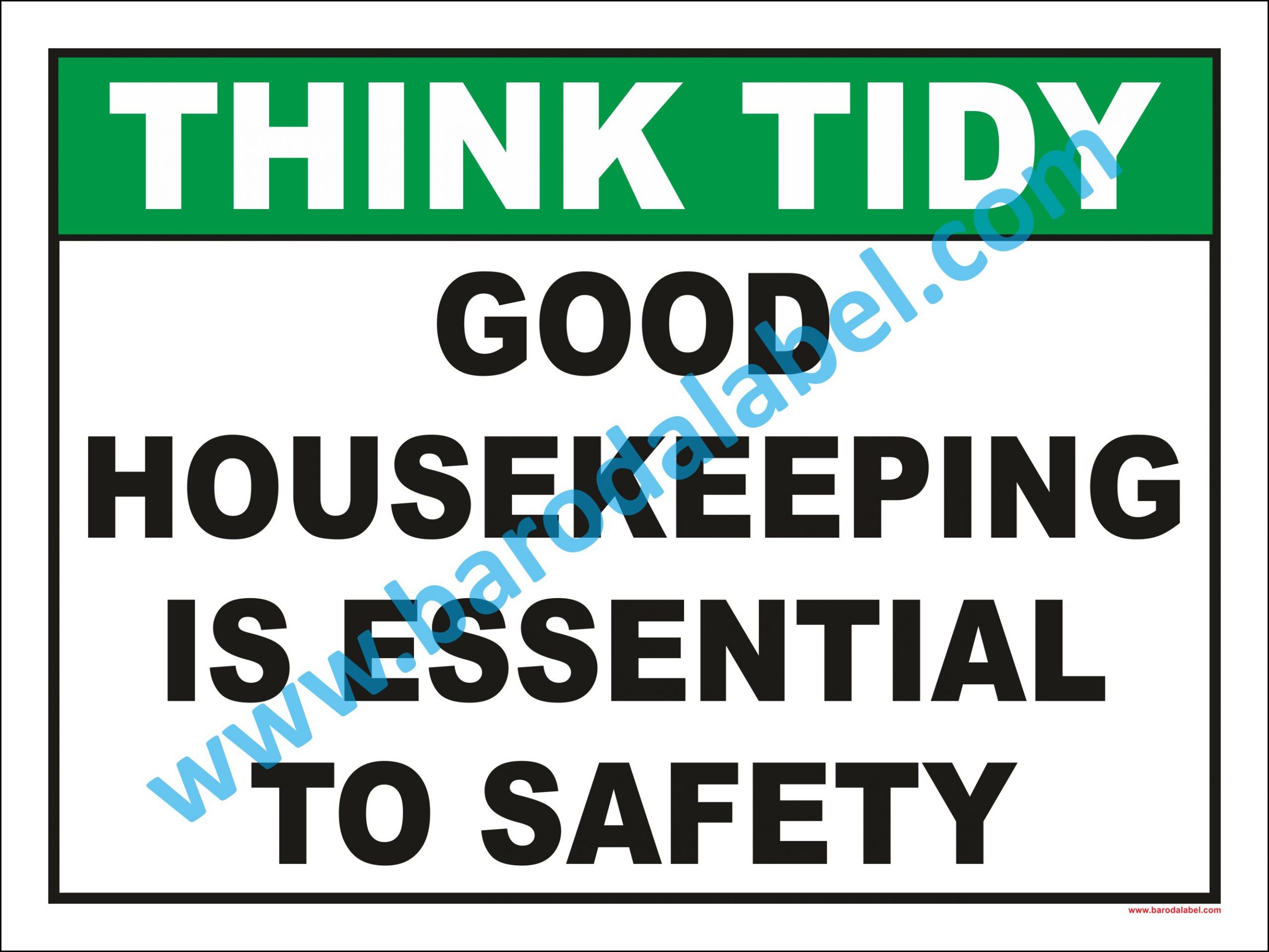 THINK TIDY GOOD HOUSEKEEPING IS ESSENTIAL TO SAFETY Vinyl printed sticker, Digitally printed available with or without lamination film pasted on 5 mm thick PVC sunboard or 3 mm thick ACP (Aluminum Composite Panel) Sheet. Sunboard signage with 4 eyelets or ACP signage with 4 holes provided for fixing.