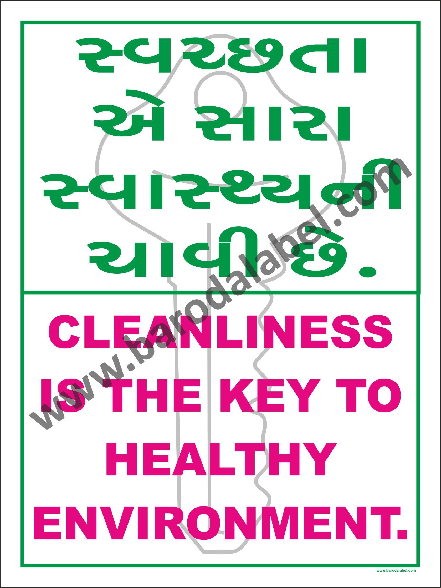 SWACHHTA AE SARA SWASTHYA NI CHAVI CHHE. Vinyl printed sticker, Digitally printed available with or without lamination film pasted on 5 mm thick PVC sunboard or 3 mm thick ACP (Aluminum Composite Panel) Sheet. Sunboard signage with 4 eyelets or ACP signage with 4 holes provided for fixing.
