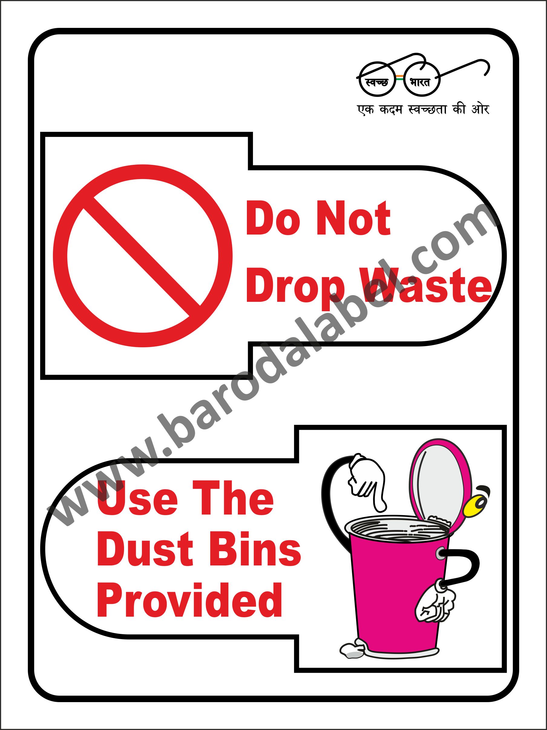DO Not Drop Waste Use The Dust Bins Provided. Vinyl printed sticker, Digitally printed available with or without lamination film pasted on 5 mm thick PVC sunboard or 3 mm thick ACP (Aluminum Composite Panel)