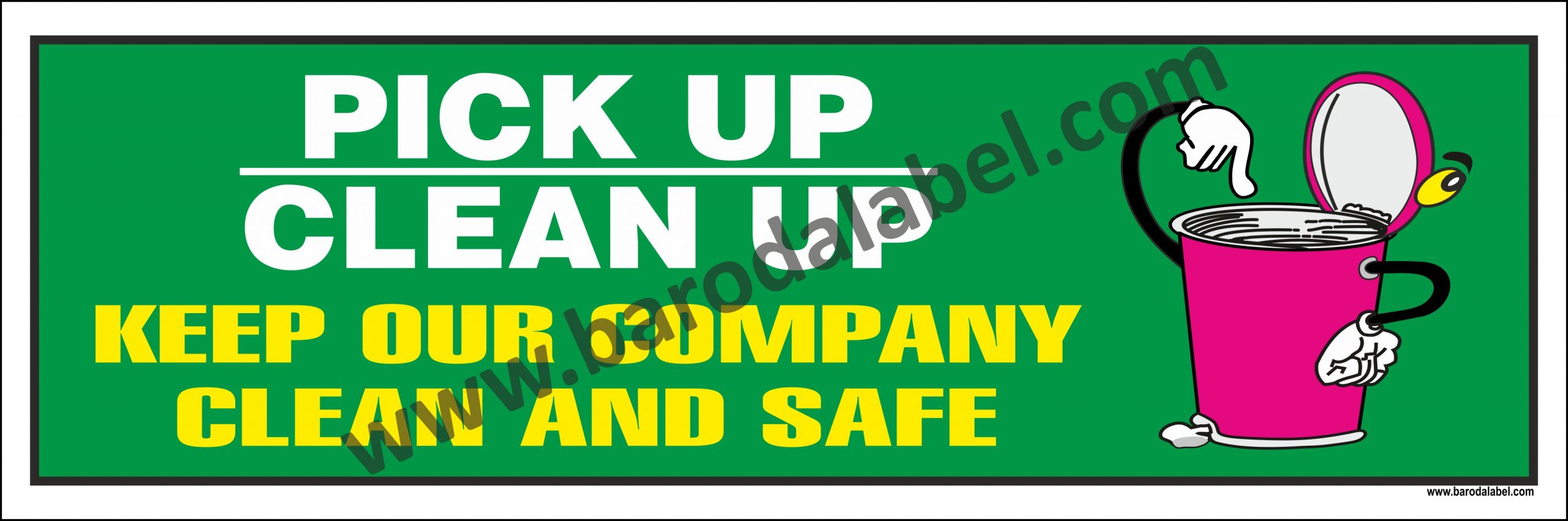 PICK UP CLEAN UO KEEP OUR COMPANY CLEAN AND SAFE. Vinyl printed sticker, Digitally printed available with or without lamination film pasted on 5 mm thick PVC sunboard or 3 mm thick ACP (Aluminum Composite Panel) Sheet. Sunboard signage with 4 eyelets or ACP signage with 4 holes provided for fixing.