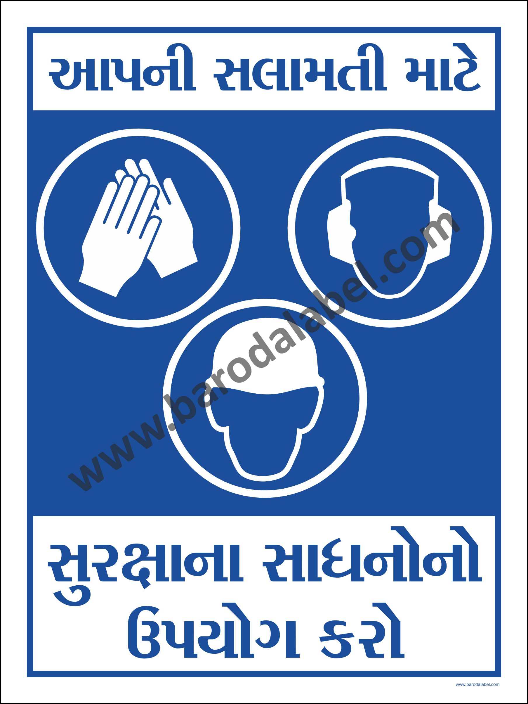 AAPNI SURKSHA MATE SURKSHA NA SADHANO NO UPYOG KARO.(GUJARATI) Vinyl printed sticker, Digitally printed available with or without lamination film pasted on 5 mm thick PVC Sunboard or 3 mm thick ACP Sheet. Sunboard signage with 4 eyelets or ACP signage with 4 holes provided for fixing.