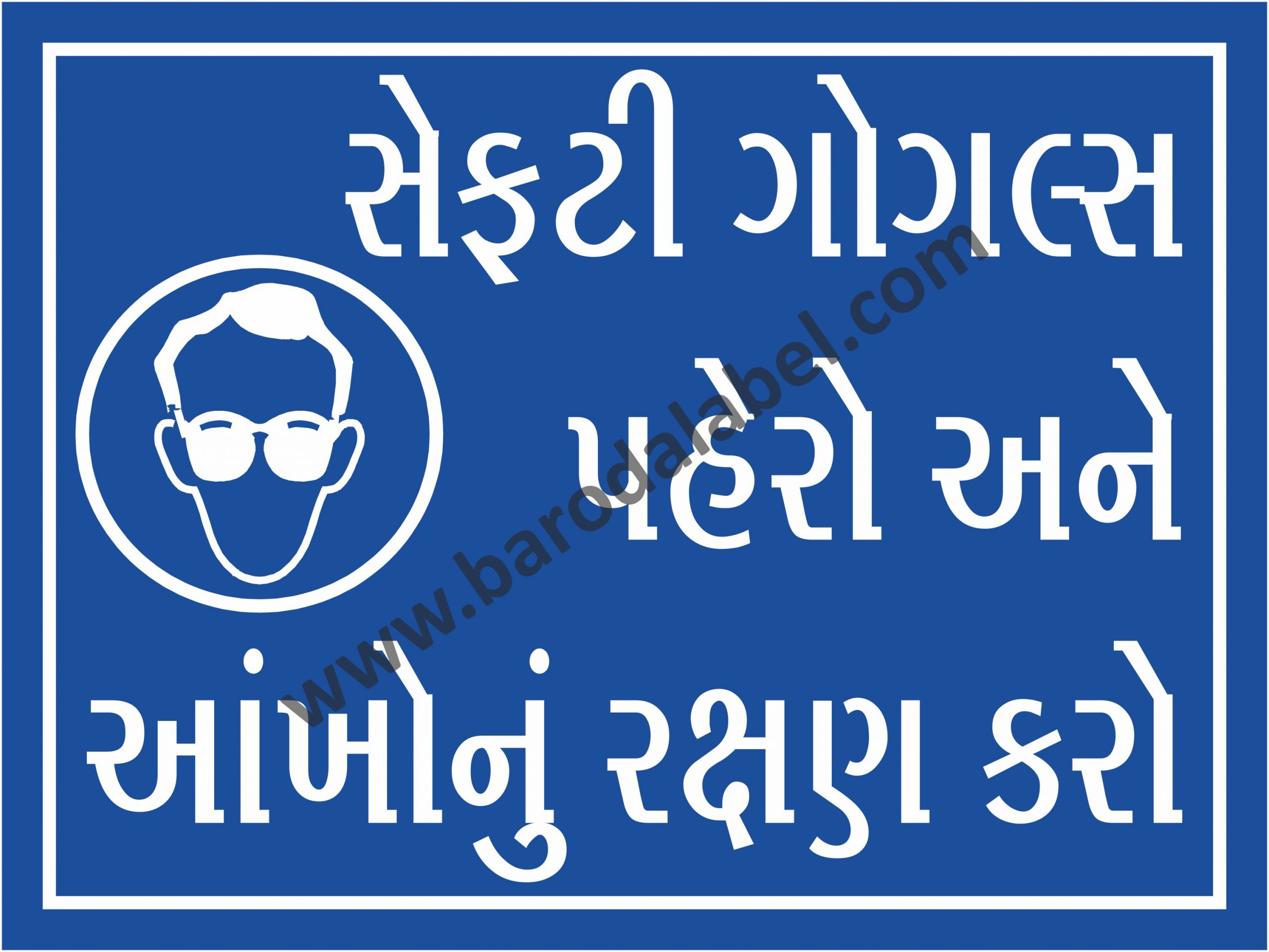 SAFETY GOGGLES PAHERO ANE AANKHO NU RAKSHAN KARO.(GUJARATI) Vinyl printed sticker, Digitally printed available with or without lamination film pasted on 5 mm thick PVC Sunboard or 3 mm thick ACP Sheet. Sunboard signage with 4 eyelets or ACP signage with 4 holes provided for fixing.