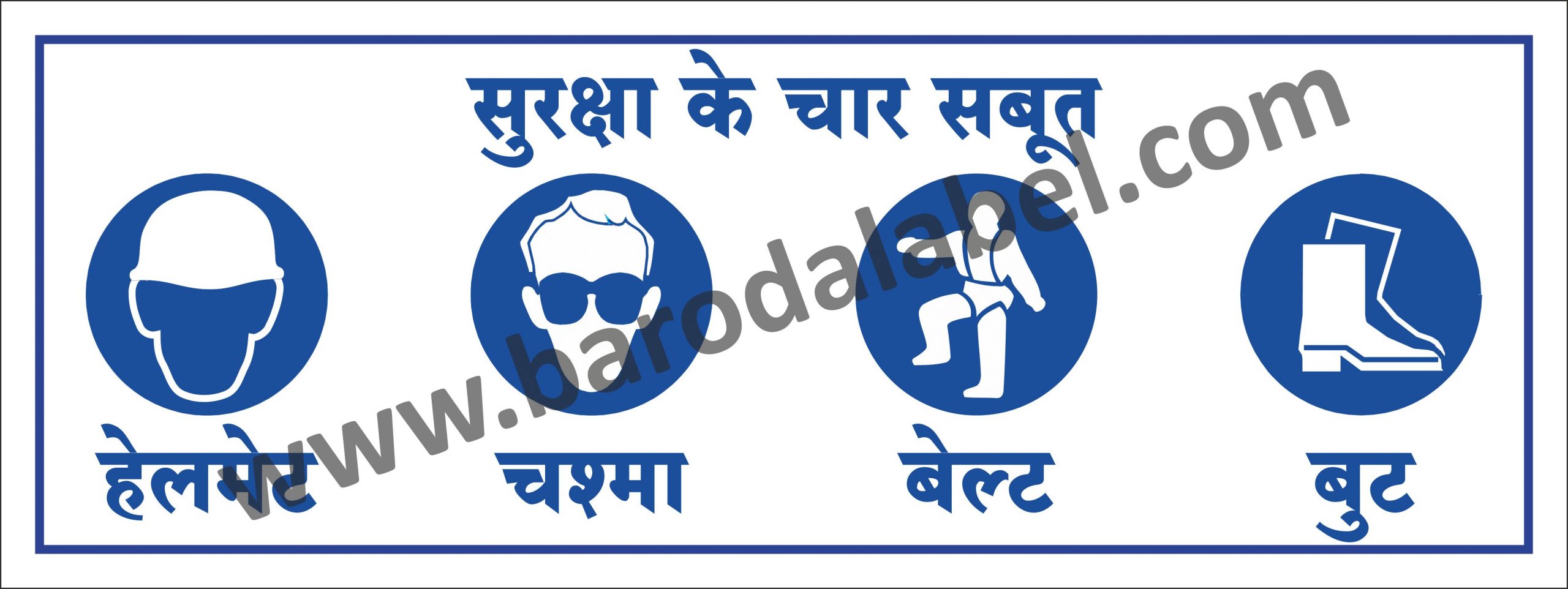 SURKSHA KE CHAR SABUT HELME,GOGGLES, BELT, SHOES.(HINDI) Vinyl printed sticker, Digitally printed available with or without lamination film pasted on 5 mm thick PVC Sunboard or 3 mm thick ACP Sheet. Sunboard signage with 4 eyelets or ACP signage with 4 holes provided for fixing.