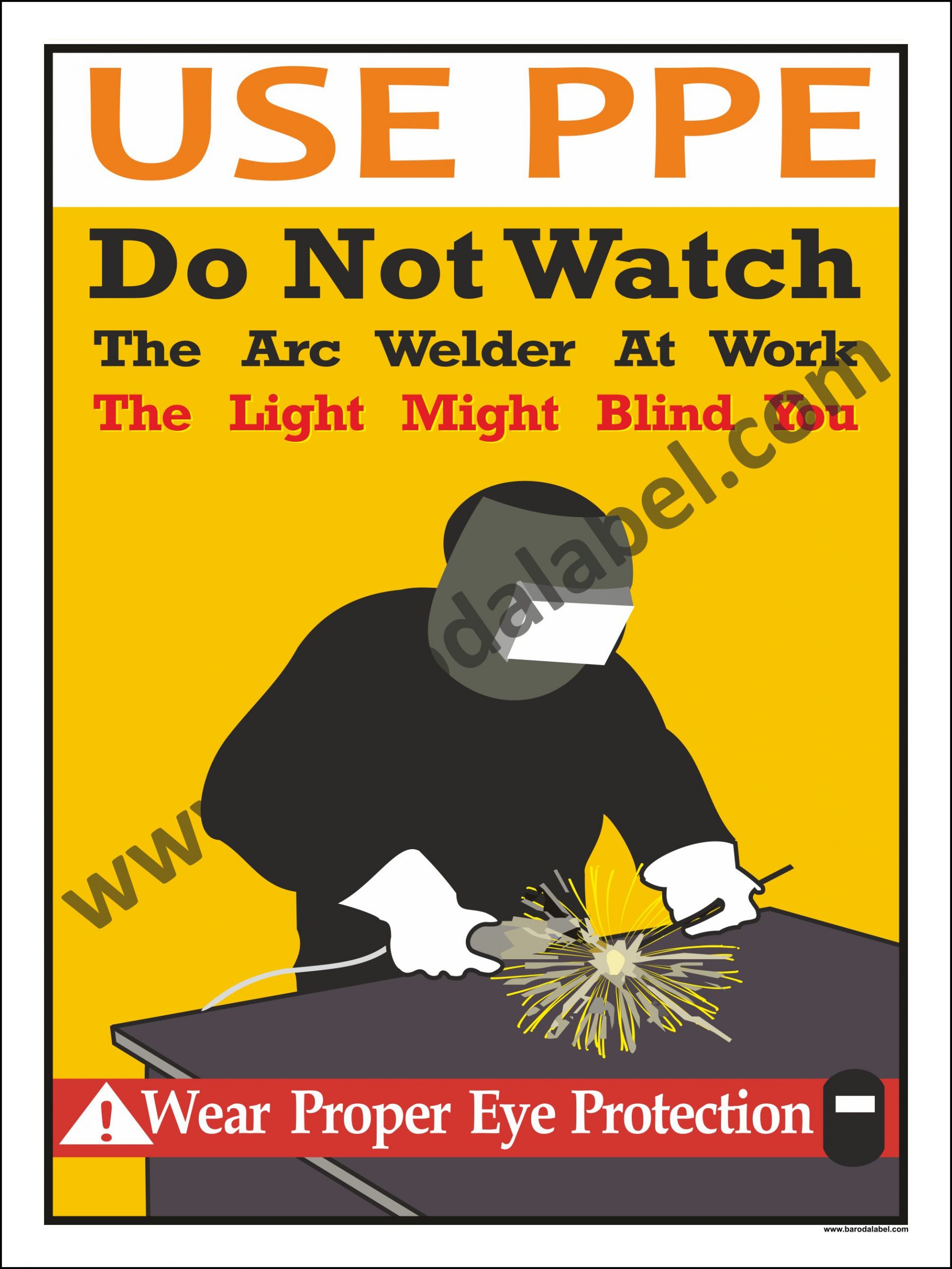 USE PPE DO NOT WATCH THE ARC WELDER AT WORK Vinyl printed sticker, Digitally printed available with or without lamination film pasted on 5 mm thick PVC Sunboard or 3 mm thick ACP Sheet. Sunboard signage with 4 eyelets or ACP signage with 4 holes provided for fixing.