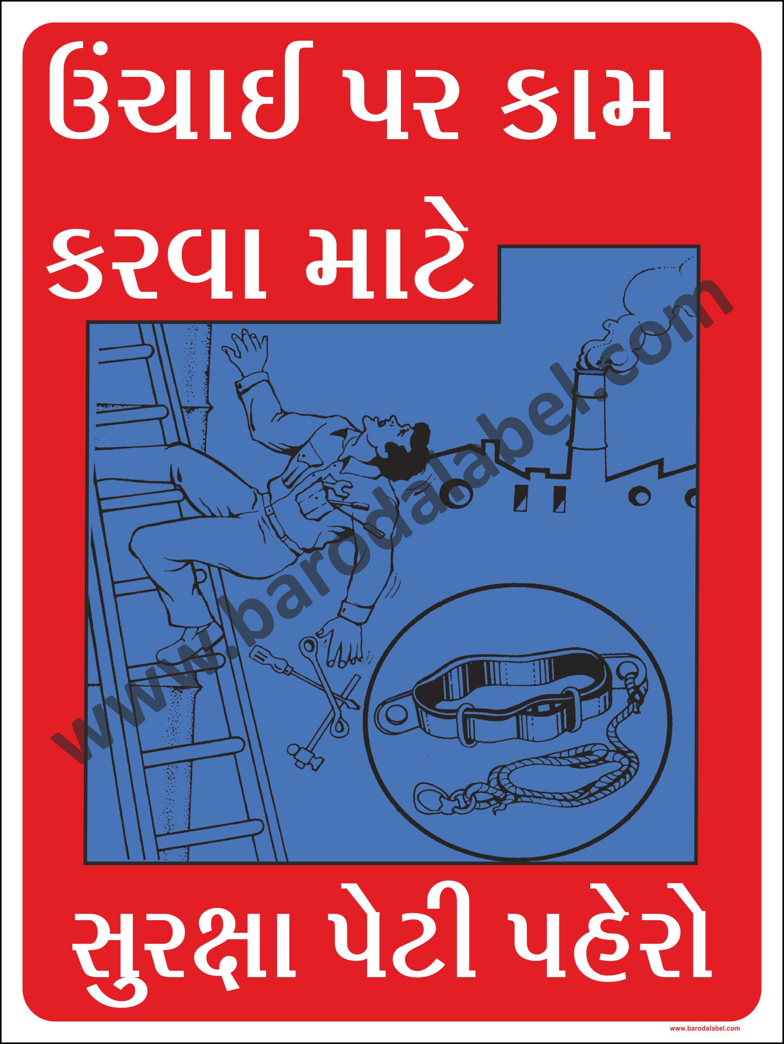 UNCHAI PAR KAM KARVA MATE SURKSHA PETI PAHERO (GUJARATI) Vinyl printed sticker, Digitally printed available with or without lamination film pasted on 5 mm thick PVC Sunboard or 3 mm thick ACP Sheet. Sunboard signage with 4 eyelets or ACP signage with 4 holes provided for fixing.