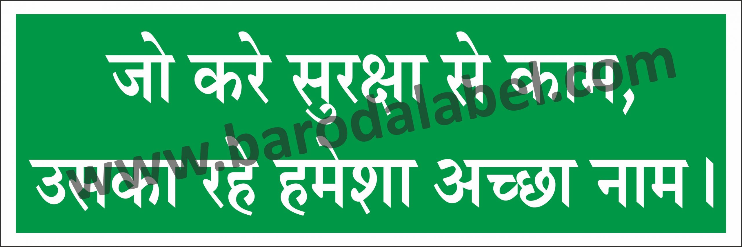 Jo Kare Suraksha Se Kaam, Uska Rahe Hamesha Acha Naam (Hindi) Vinyl printed sticker, Digital printed available with or without lamination film pasted on 5 mm thick PVC sunboard or 3 mm thick ACP (Aluminium Composite Panel) Sheet. Sunboard signage with 4 eyelets or ACP signage with 4 holes provided for fixing.