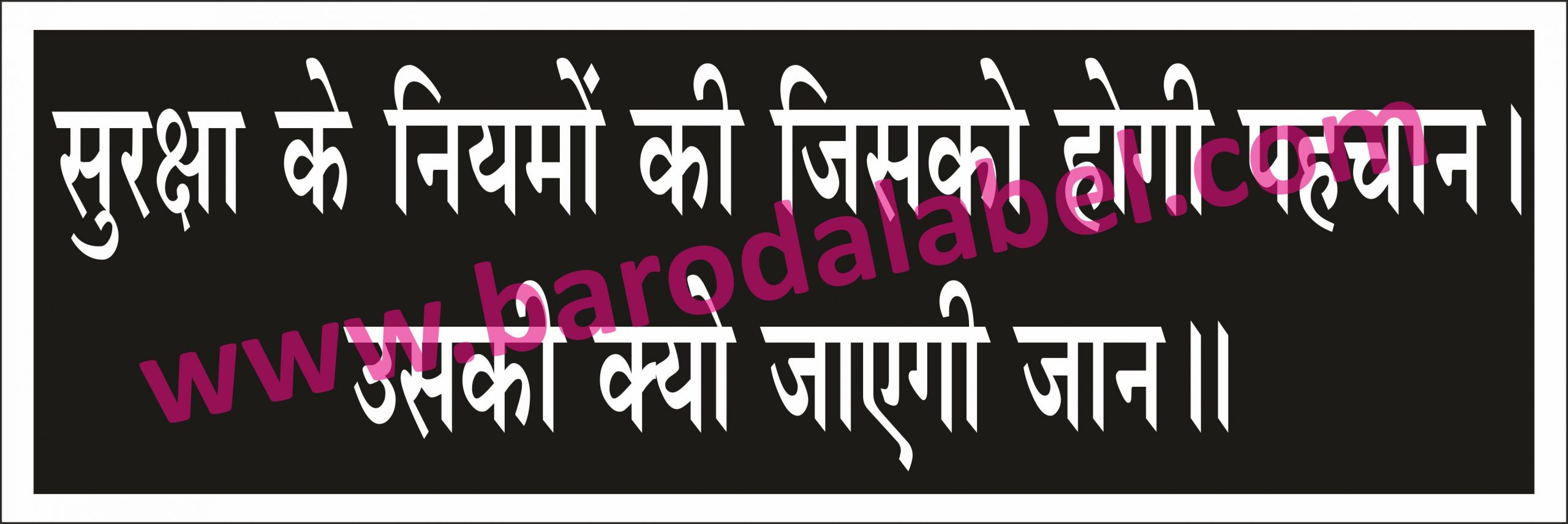 Suraksha ke niyamo ki jisko hogi pahachan, uski kyuh jayegi jaan (Hindi) Vinyl printed sticker, Digital printed available with or without lamination film pasted on 5 mm thick PVC sunboard or 3 mm thick ACP (Aluminium Composite Panel) Sheet. Sunboard signage with 4 eyelets or ACP signage with 4 holes provided for fixing.