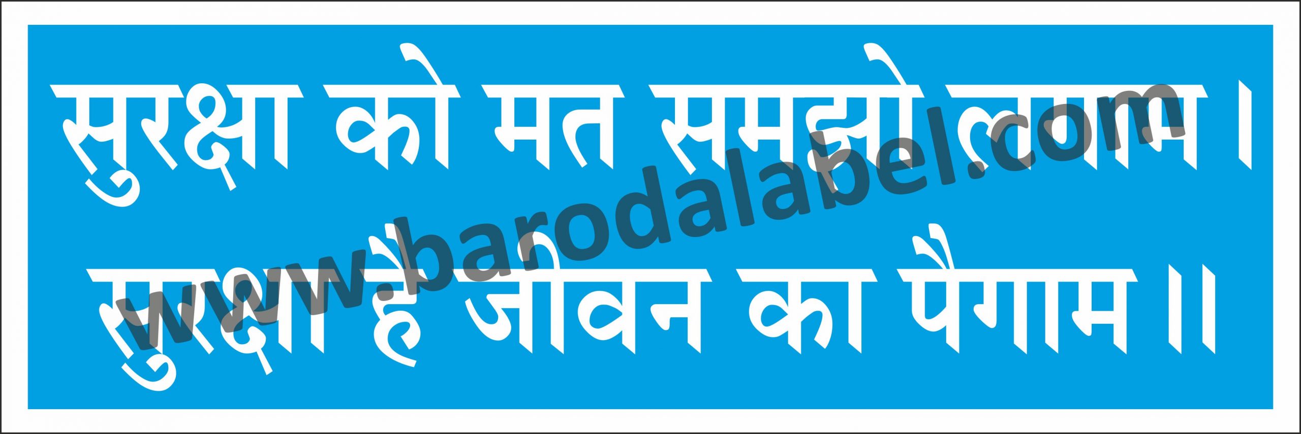 Suraksha Ko Mat Samjo Lagam, Suraksha Haih Jivan Ka Pagam (Hindi) Vinyl printed sticker, Digital printed available with or without lamination film pasted on 5 mm thick PVC sunboard or 3 mm thick ACP (Aluminium Composite Panel) Sheet. Sunboard signage with 4 eyelets or ACP signage with 4 holes provided for fixing.