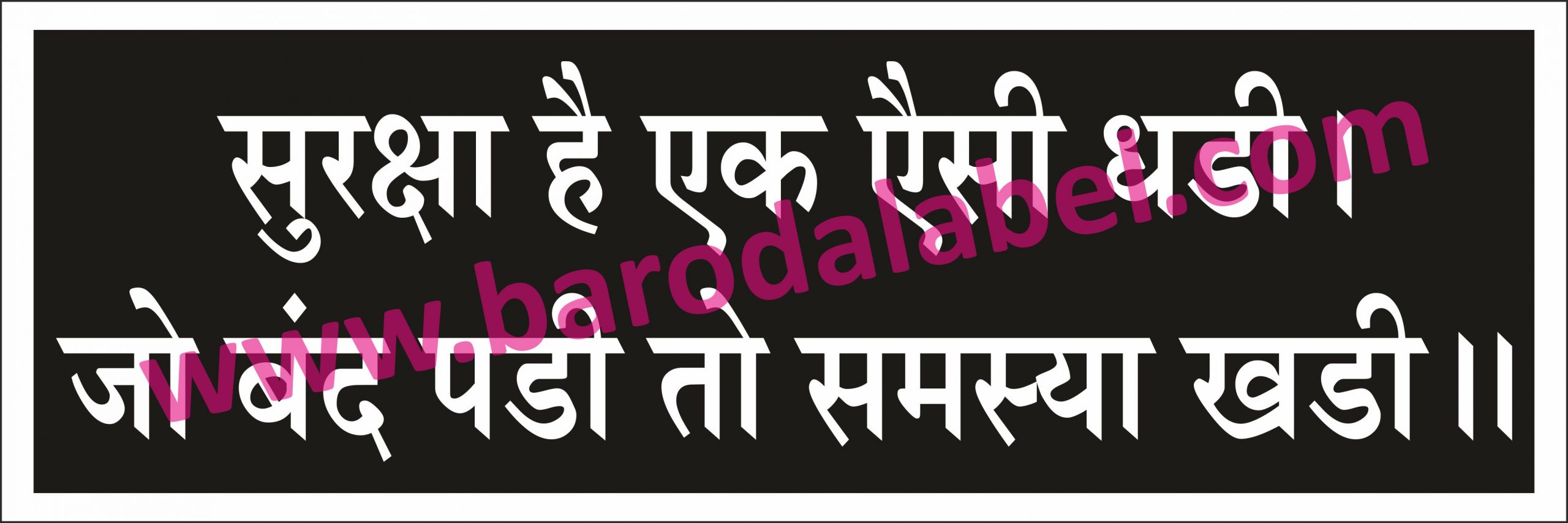 Suraksha Haih Ek Esi Ghadi, Jo Bandh Padi Toh Samasya Khadi (Hindi) Vinyl printed sticker, Digital printed available with or without lamination film pasted on 5 mm thick PVC sunboard or 3 mm thick ACP (Aluminium Composite Panel) Sheet. Sunboard signage with 4 eyelets or ACP signage with 4 holes provided for fixing.