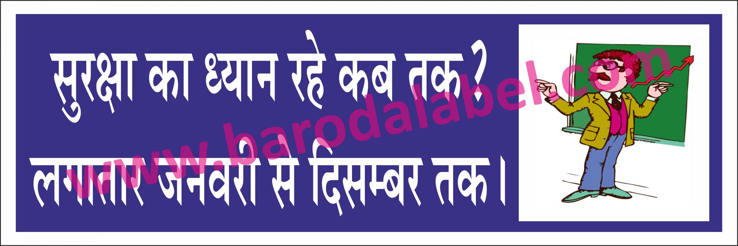 Suraksha Ka Dhyan Rahe Kab Tak ? Lagatar January Se December Tak (Hindi) Vinyl printed sticker, Digital printed available with or without lamination film pasted on 5 mm thick PVC sunboard or 3 mm thick ACP (Aluminium Composite Panel) Sheet. Sunboard signage with 4 eyelets or ACP signage with 4 holes provided for fixing.