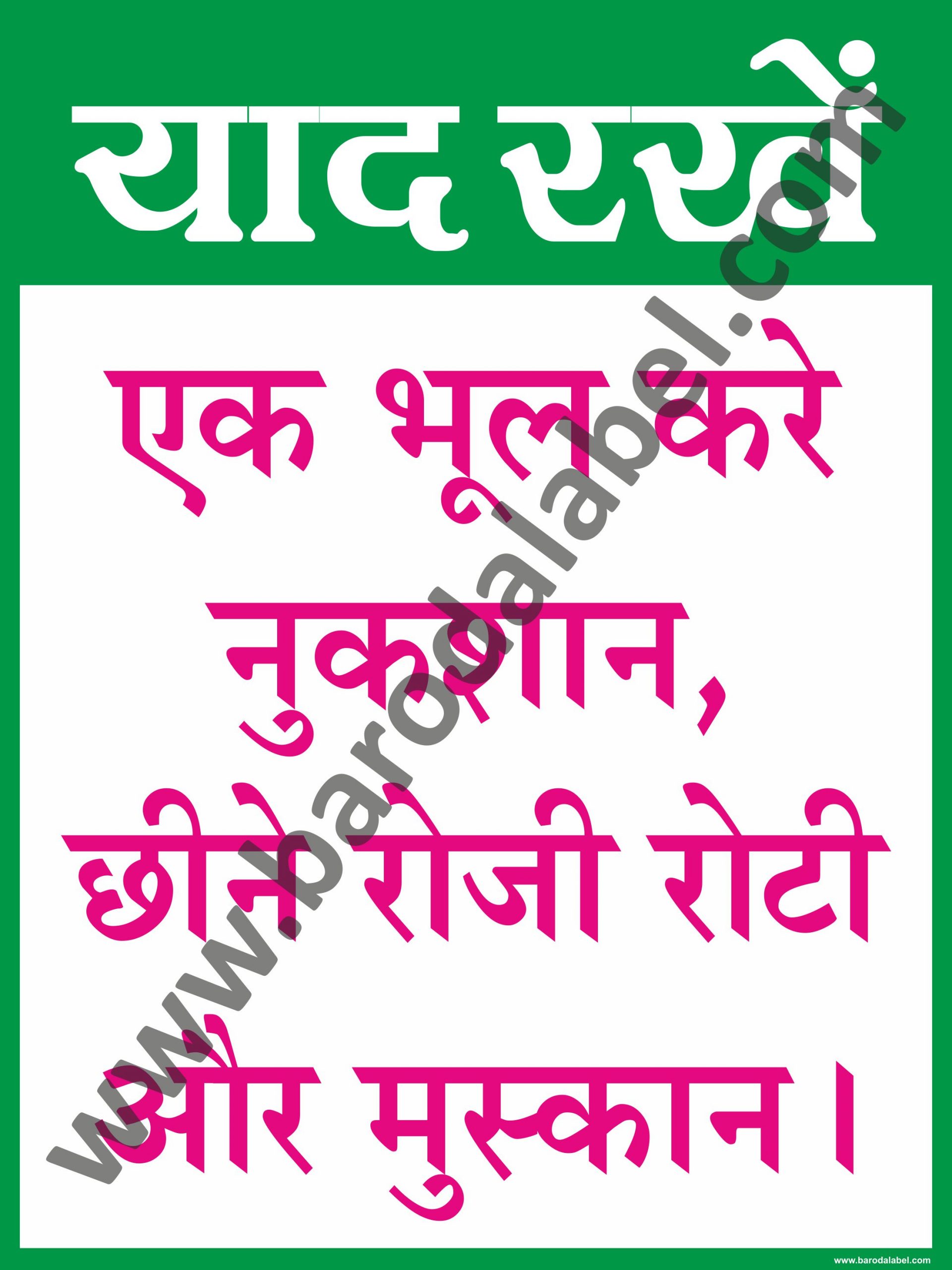 Ek Bhul Kare Nukshan, Chine Roji Roti Aur Muskan (Hindi) Vinyl printed sticker, Digital printed available with or without lamination film pasted on 5 mm thick PVC sunboard or 3 mm thick ACP (Aluminium Composite Panel) Sheet. Sunboard signage with 4 eyelets or ACP signage with 4 holes provided for fixing.