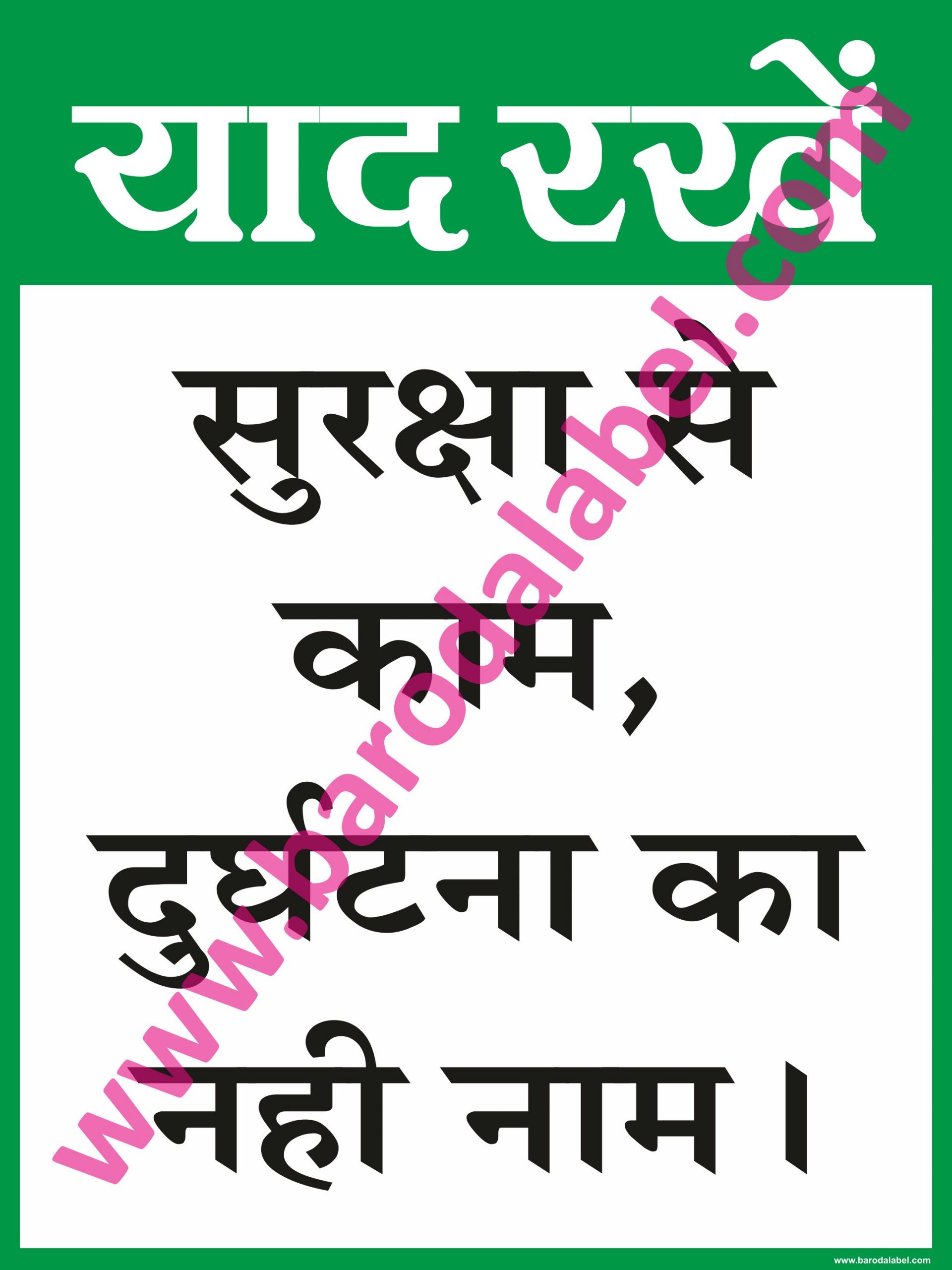 Suraksha Se Kaam, Durghatna Ka Nahi Naam (Hindi) Vinyl printed sticker, Digital printed available with or without lamination film pasted on 5 mm thick PVC sunboard or 3 mm thick ACP (Aluminium Composite Panel) Sheet. Sunboard signage with 4 eyelets or ACP signage with 4 holes provided for fixing.