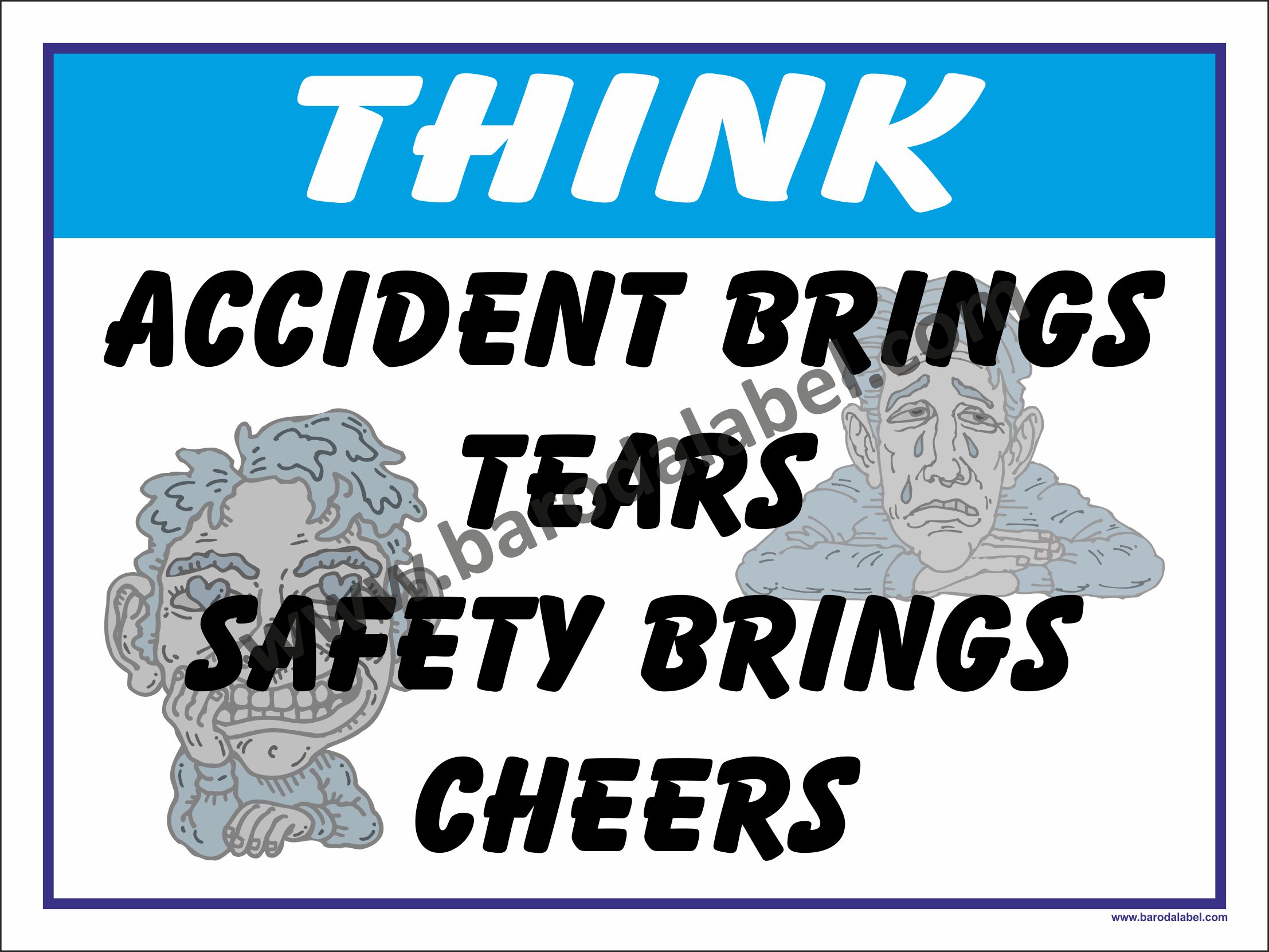Accident Brings Tears, Safety Brings Cheers Vinyl printed sticker, Digital printed available with or without lamination film pasted on 5 mm thick PVC sunboard or 3 mm thick ACP (Aluminium Composite Panel) Sheet. Sunboard signage with 4 eyelets or ACP signage with 4 holes provided for fixing.