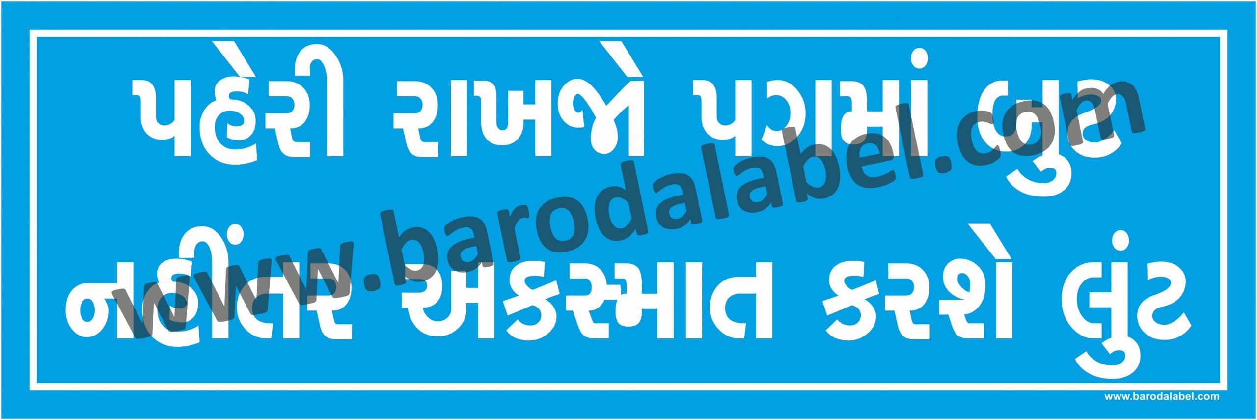 Paheri Rakhjo Pag ma Boot, Nahitar Akasmat Karse Loot (Gujarati) Vinyl printed sticker, Digital printed available with or without lamination film pasted on 5 mm thick PVC sunboard or 3 mm thick ACP (Aluminium Composite Panel) Sheet. Sunboard signage with 4 eyelets or ACP signage with 4 holes provided for fixing.
