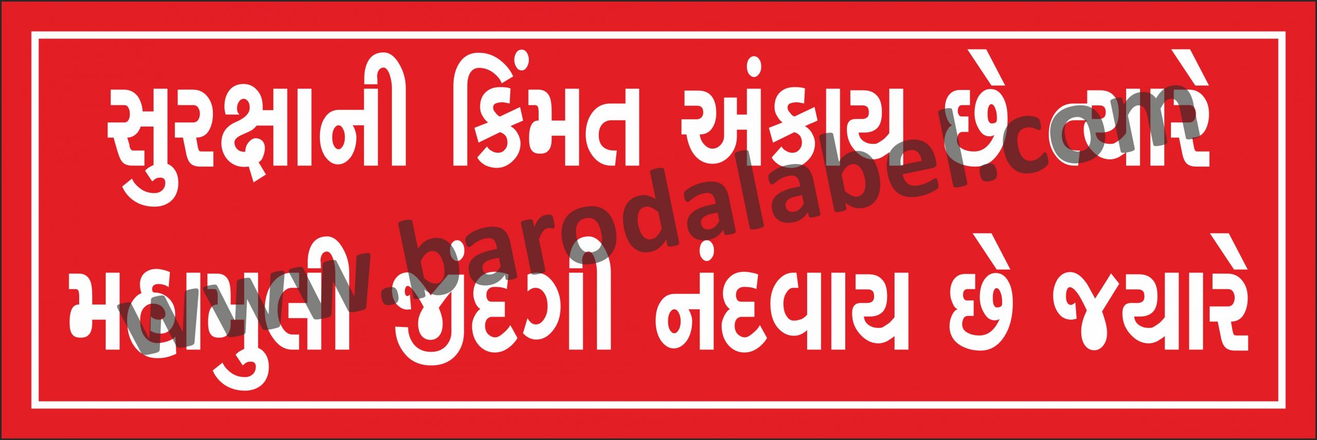 Suraksha ni kimmat ankay che tyare, mahamuli zindagi nandyay che tyare (Gujarati) Vinyl printed sticker, Digital printed available with or without lamination film pasted on 5 mm thick PVC sunboard or 3 mm thick ACP (Aluminium Composite Panel) Sheet. Sunboard signage with 4 eyelets or ACP signage with 4 holes provided for fixing.