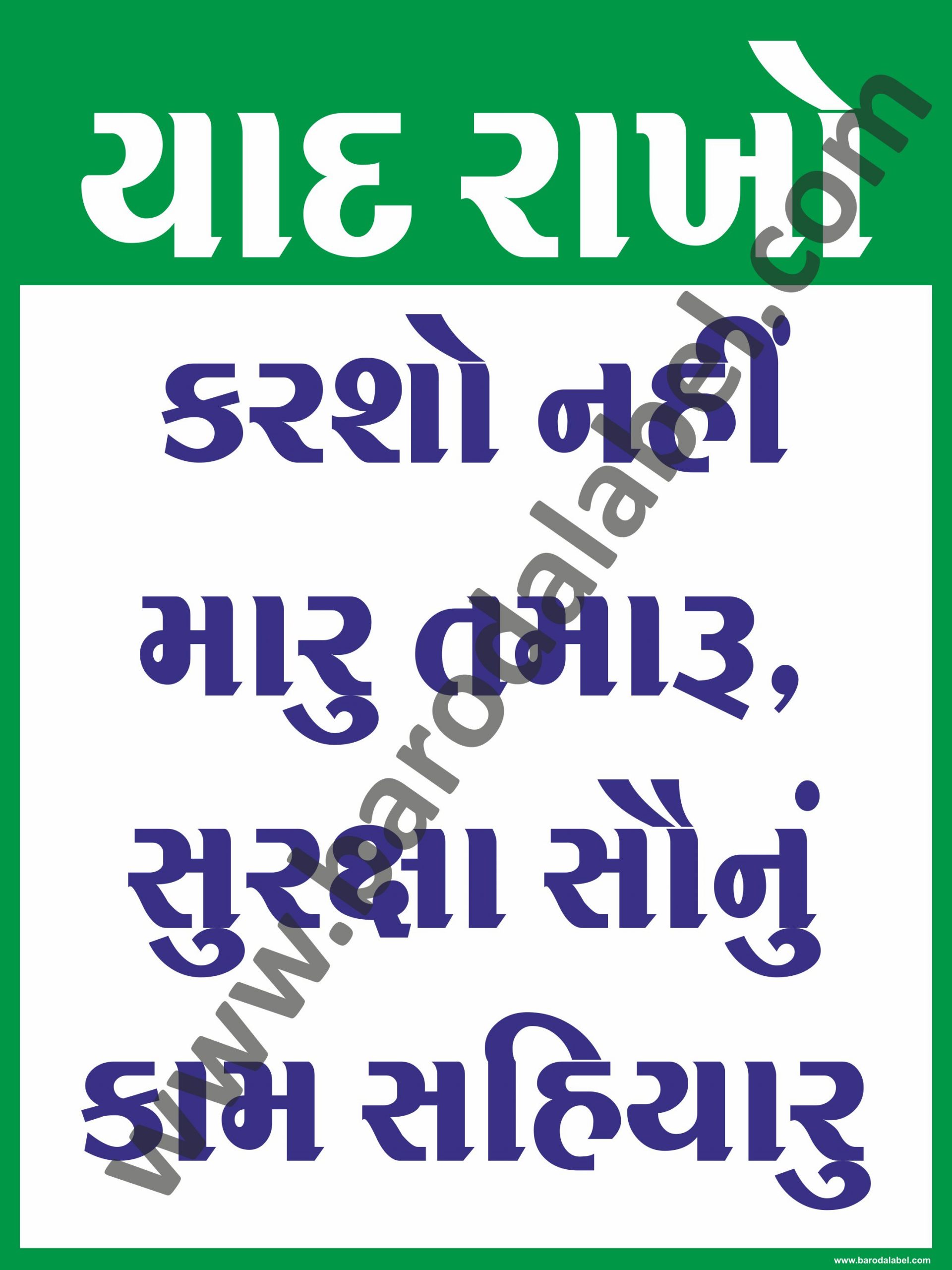 Karso Nahi Maru Tamaru, Suraksha Saunu Kaam Sahiyaru (Gujarati) Vinyl printed sticker, Digital printed available with or without lamination film pasted on 5 mm thick PVC sunboard or 3 mm thick ACP (Aluminium Composite Panel) Sheet. Sunboard signage with 4 eyelets or ACP signage with 4 holes provided for fixing.