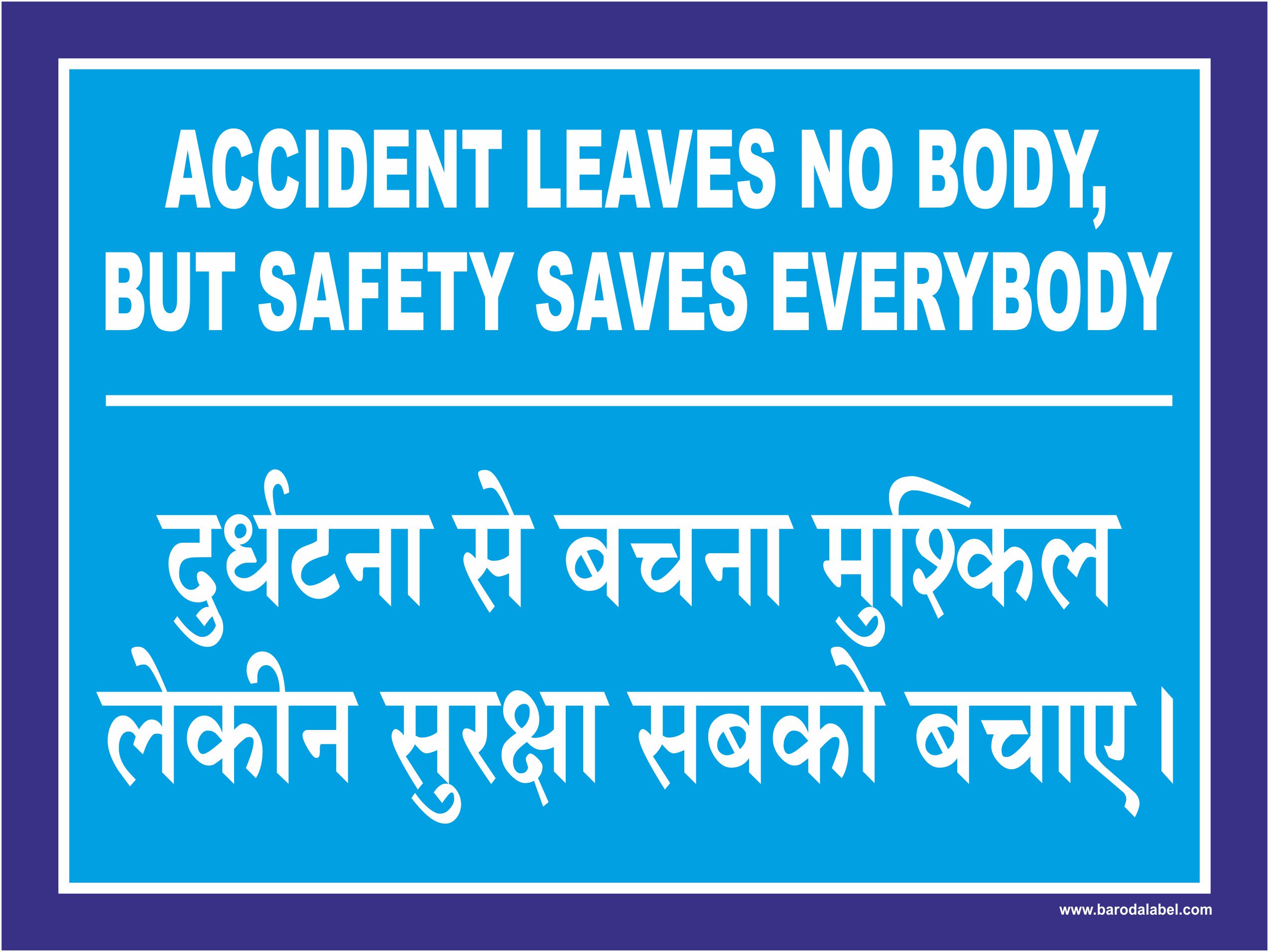 ACCIDENT LEAVES NO BODY, BUT SAFETY SAVES EVERYBODY Vinyl printed sticker, Digitally printed available with or without lamination film pasted on 5 mm thick PVC sunboard or 3 mm thick ACP (Aluminum Composite Panel) Sheet. Sunboard signage with 4 eyelets or ACP signage with 4 holes provided for fixing.