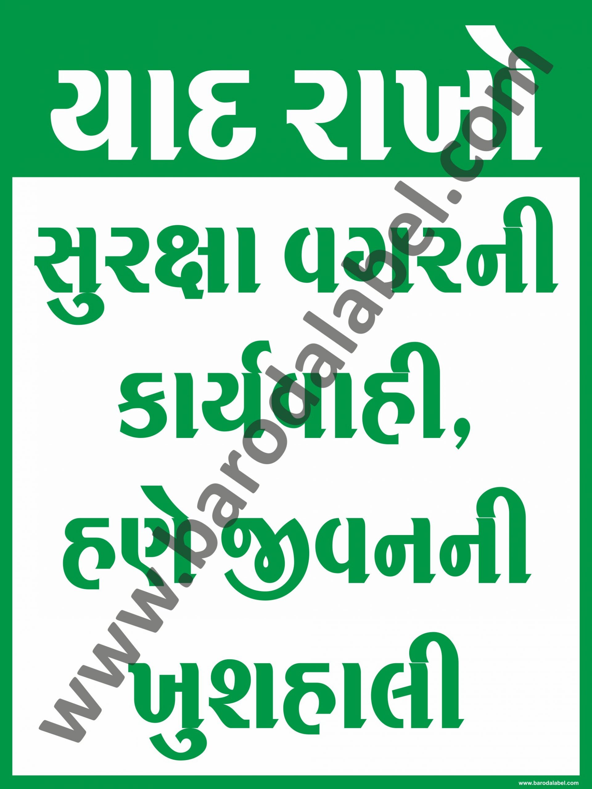 Suraksha Vagar Ni Karyavahi, Hane Jivan Ni Khushali (Gujarati) Vinyl printed sticker, Digital printed available with or without lamination film pasted on 5 mm thick PVC sunboard or 3 mm thick ACP (Aluminium Composite Panel) Sheet. Sunboard signage with 4 eyelets or ACP signage with 4 holes provided for fixing.